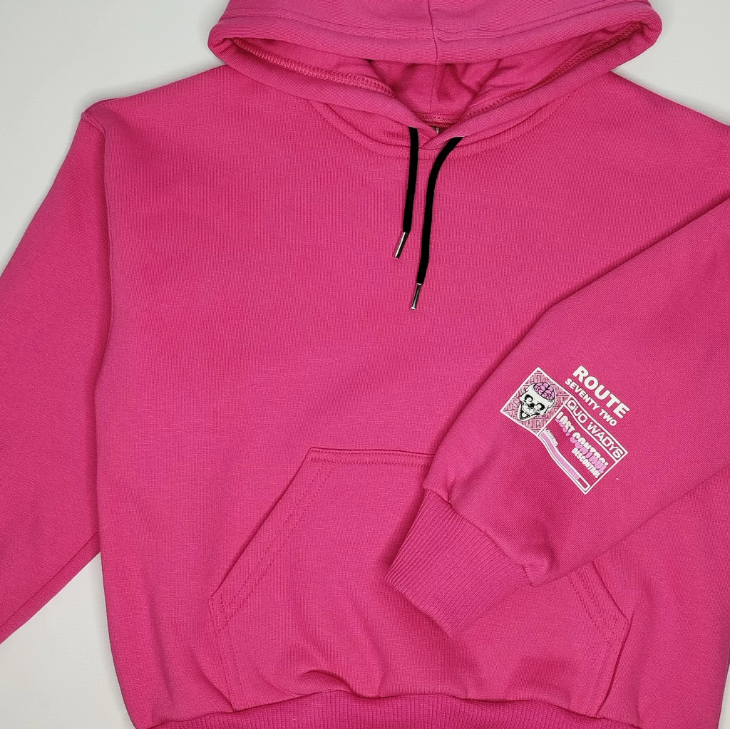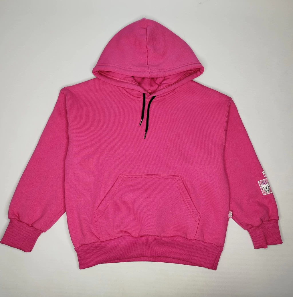 Buzo de friza liso con bolsillo tipo canguro, capucha forrada, cordon a tono, puños y cintura con rib. Detalle de estampado en manga.